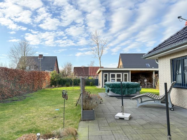 Die Terrasse und der Garten sind pflegeleicht angelegt. Ein Whirpool lädt zum Entspannen im Freien ein.